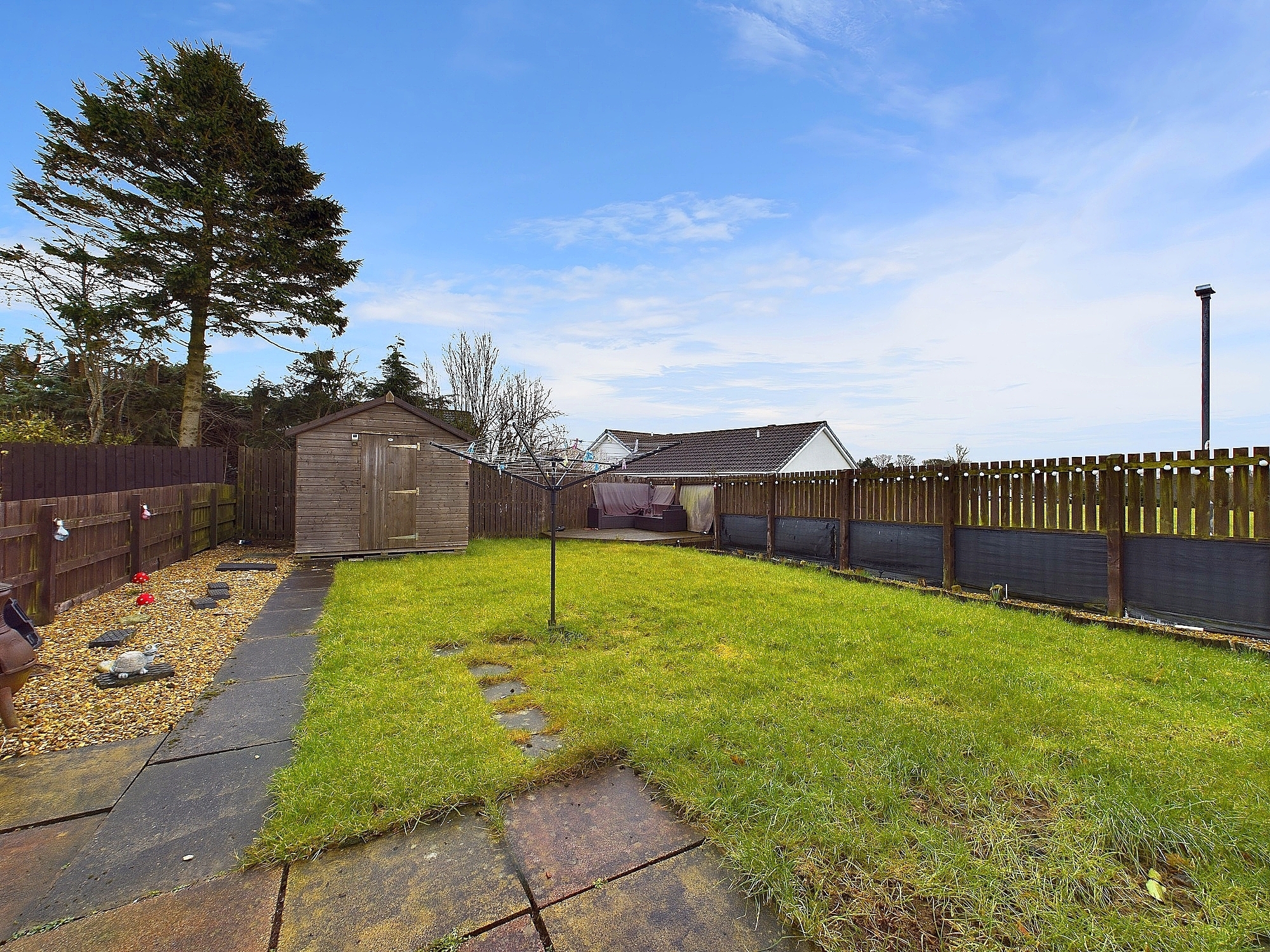 To the front of the property there is a private driveway and easily maintained area with decorative chips. The garden to the rear is fully enclosed with fencing and has a patio and a raised deck area for outdoor furniture.