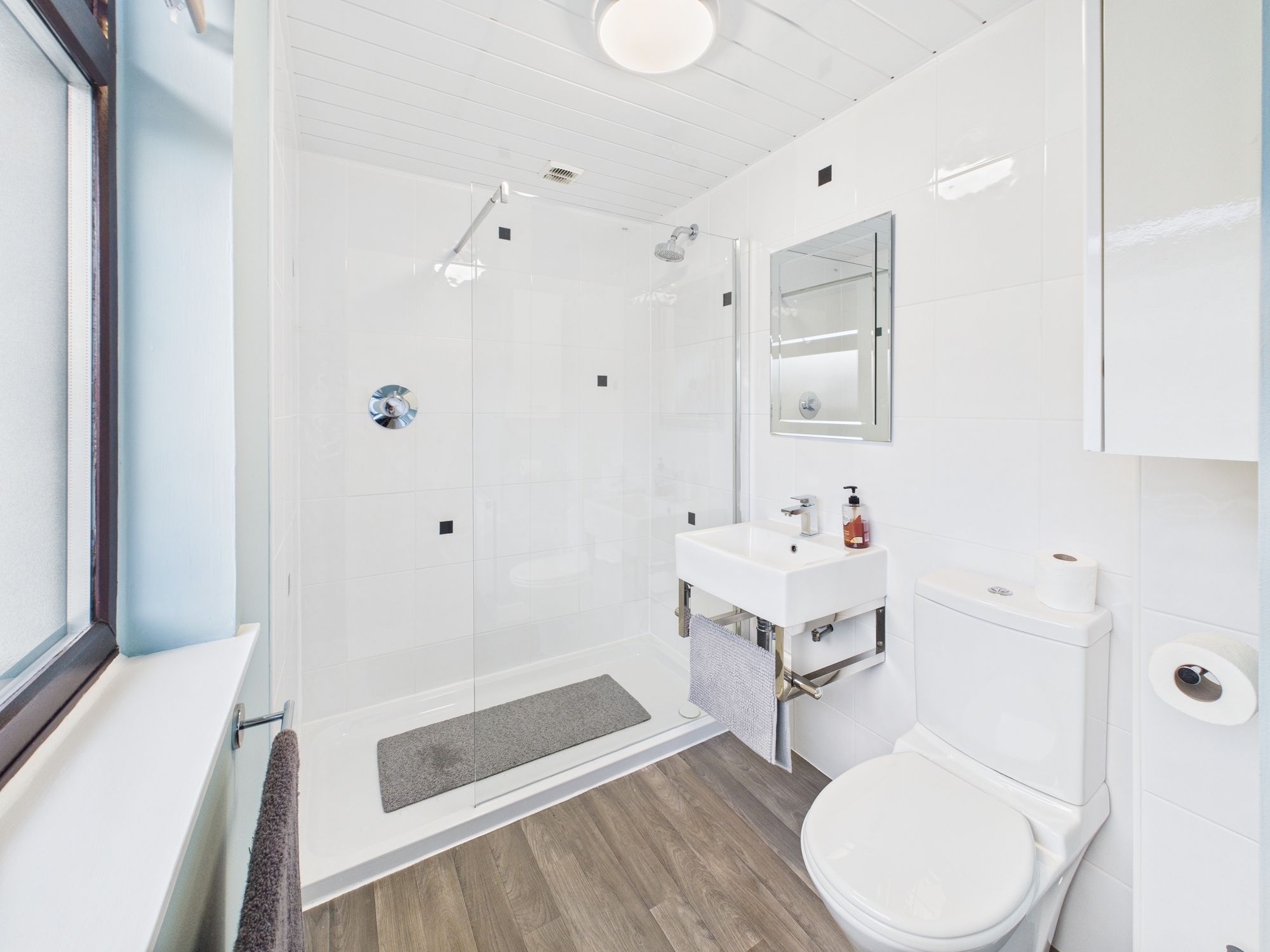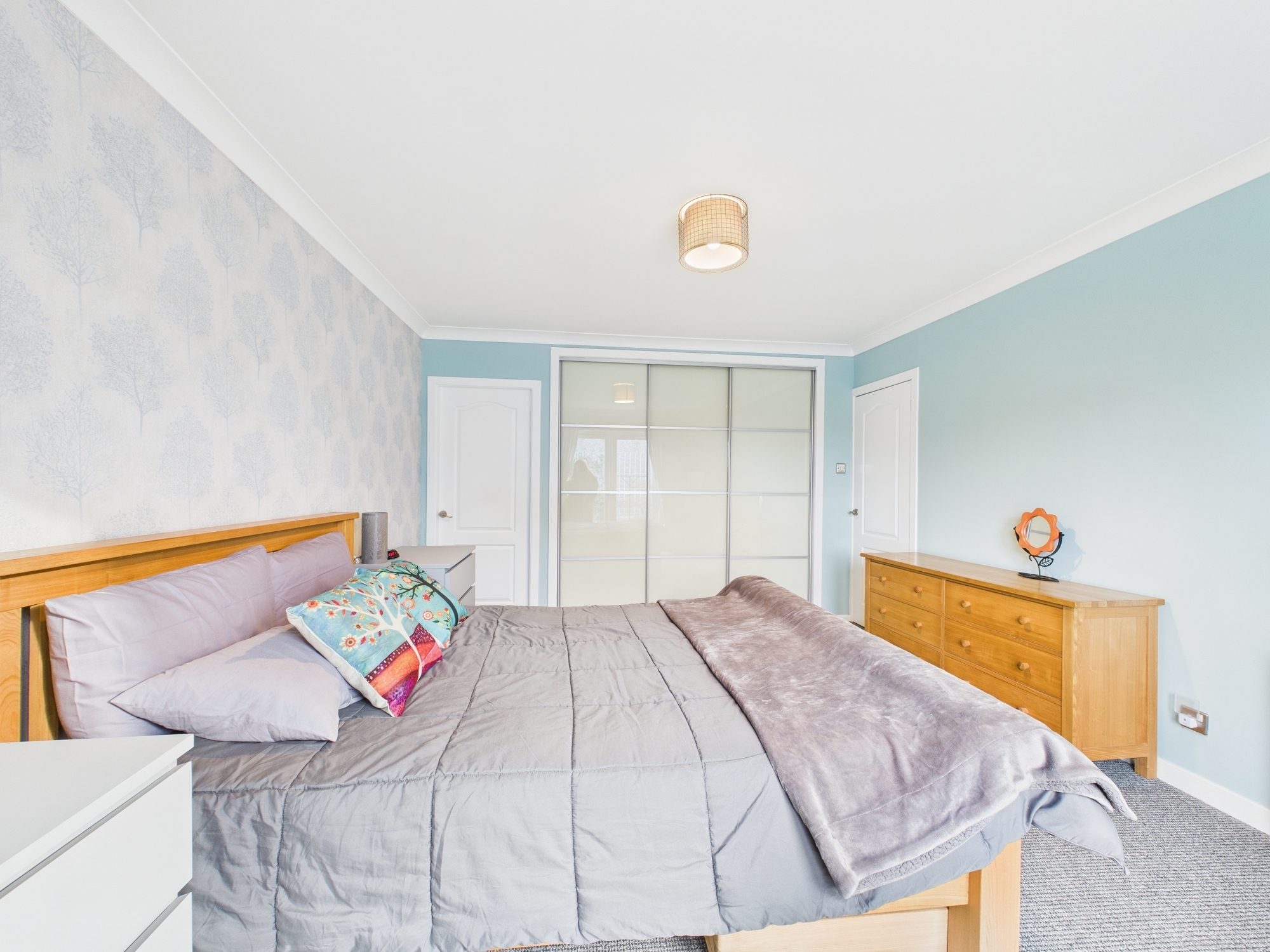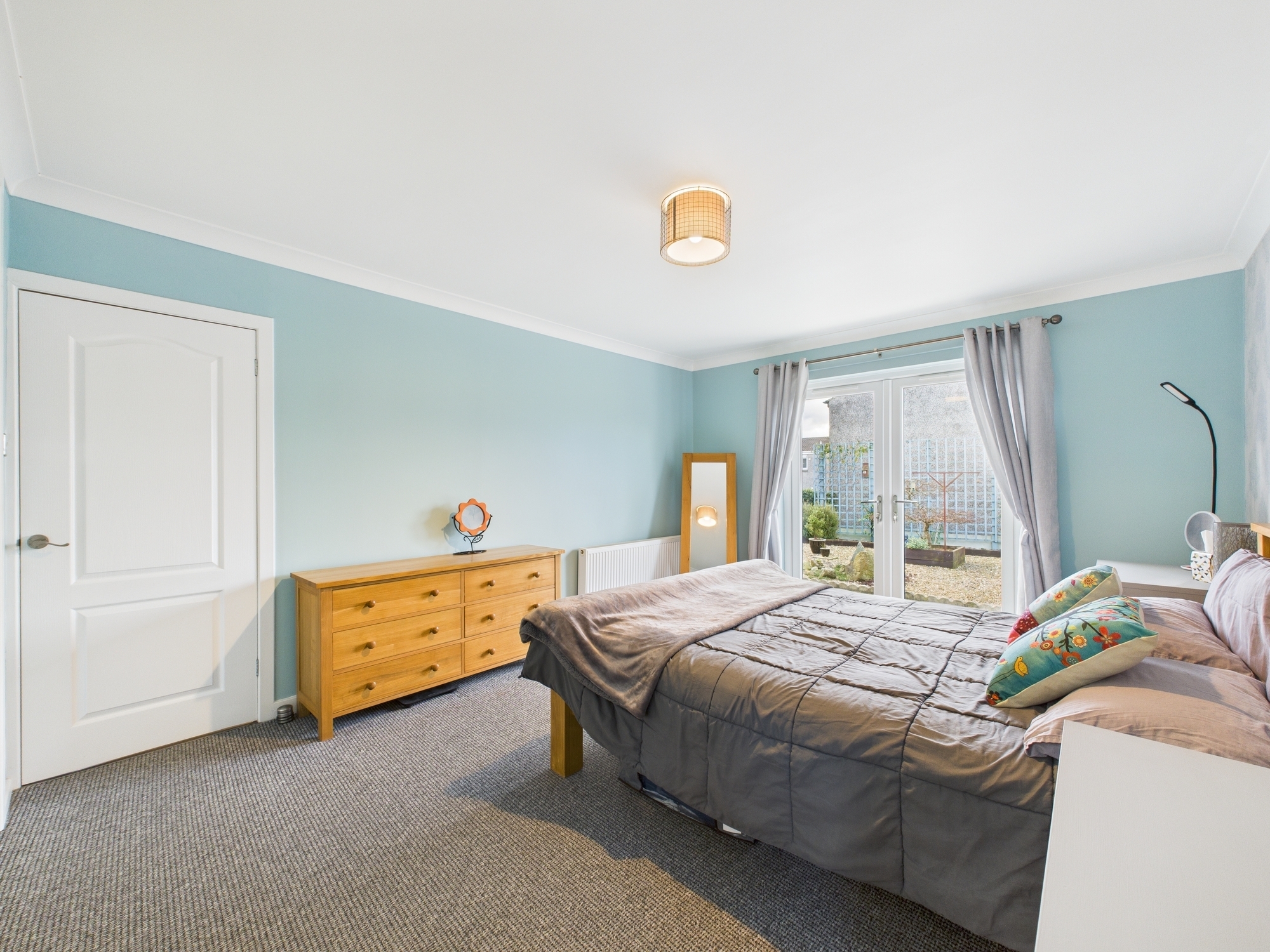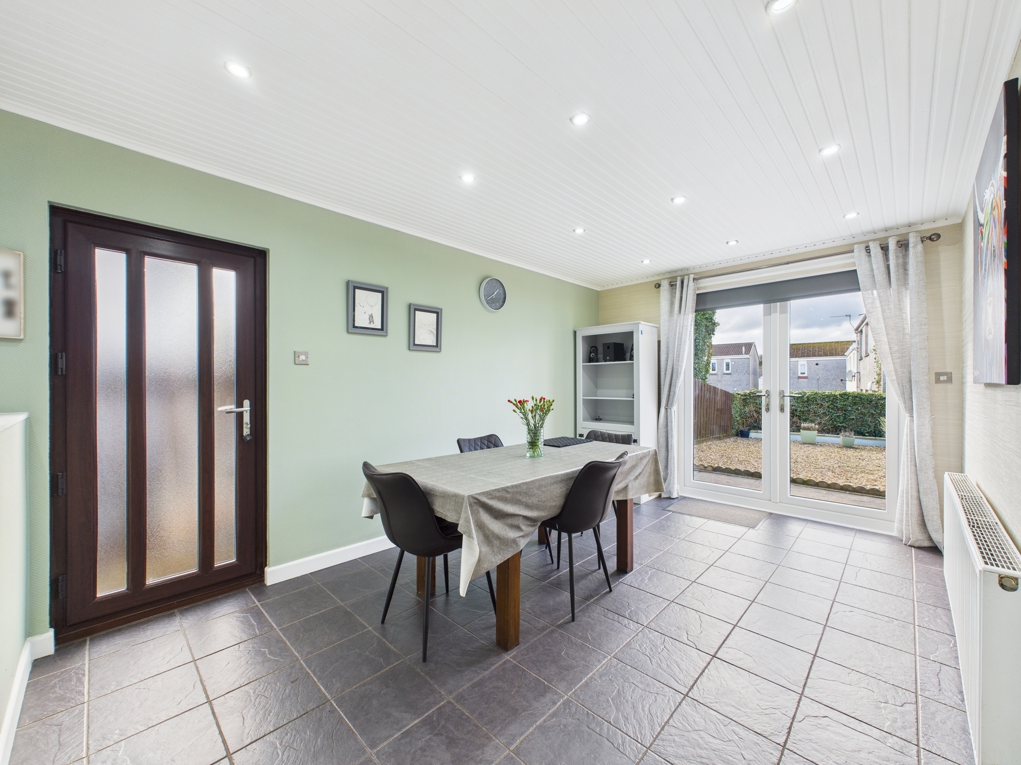 The property offers a generous master bedroom complete with fitted wardrobes, double doors opening directly out to the rear garden and a contemporary en-suite shower room. There are two further well-sized double bedrooms, one of which benefits from built-in storage. A stylish three-piece family bathroom finished in white, along with excellent hallway storage completes the internal accommodation.