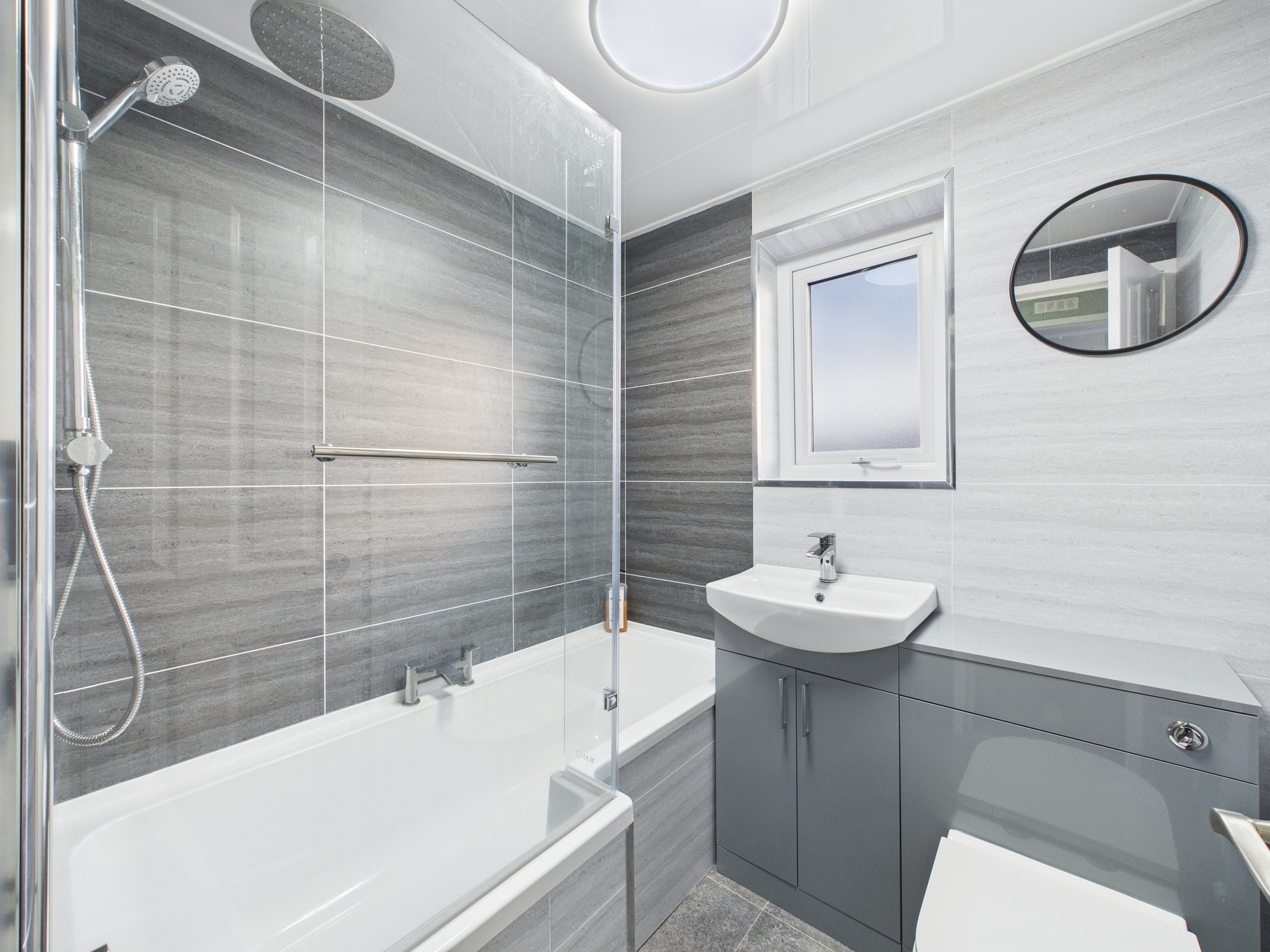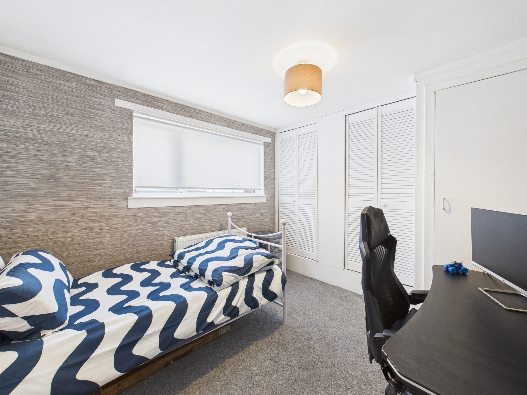 On the upper level there are two double bedrooms which both accommodate all freestanding furniture , built in storage cupboards and the modern fitted 3 piece bathroom suite in white.
