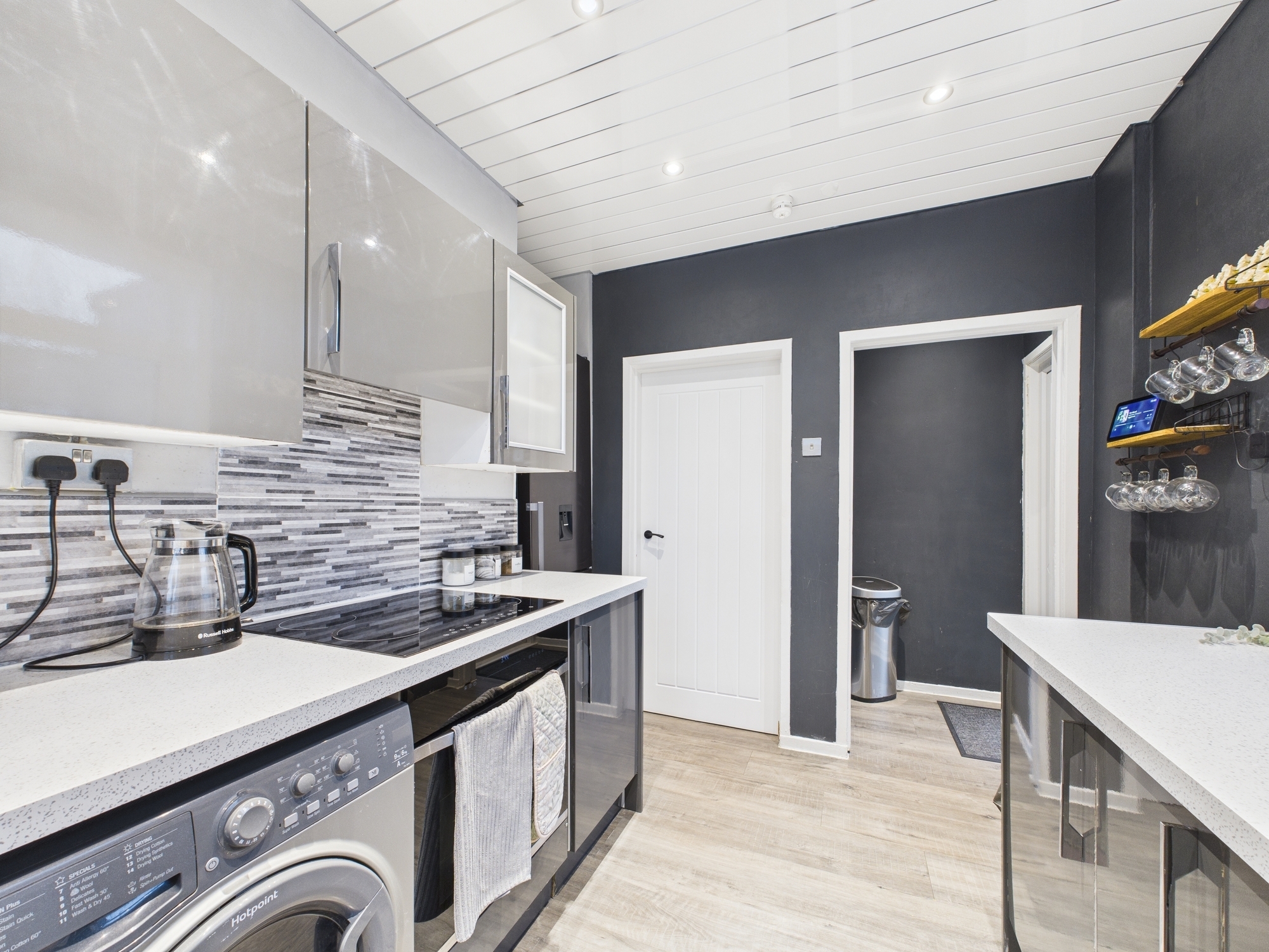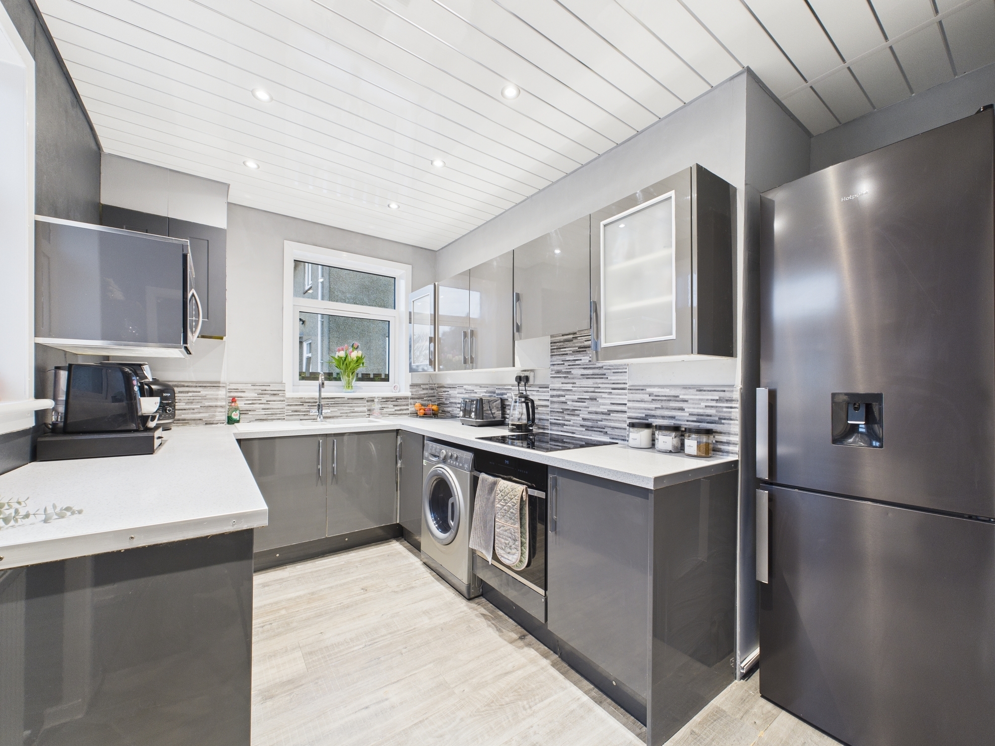 Upon entering, a welcoming hallway leads to the spacious front and rear facing lounge, flooded with natural light from large picture windows. The room offers ample space for freestanding furniture and has been tastefully decorated throughout. The lounge provides direct access to the modern fitted kitchen, which features gloss-finished units, generous storage, space for white goods and a useful porch area that can also be utilised for additional storage. Completing the ground floor is a stylish three-piece family bathroom suite in white along with a convenient storage cupboard.