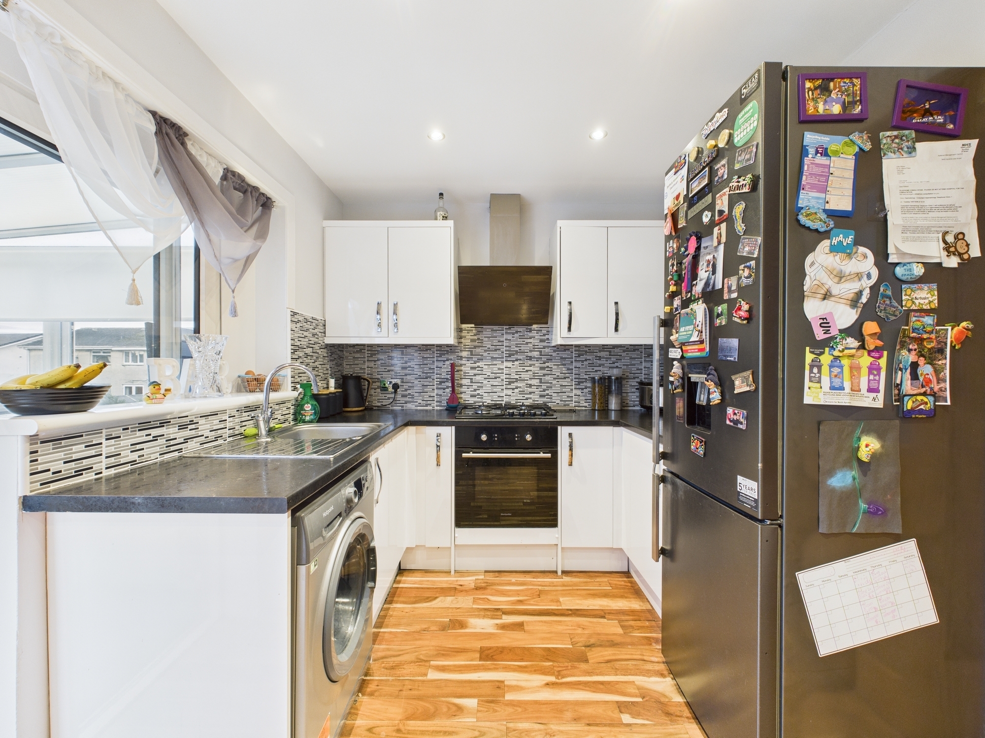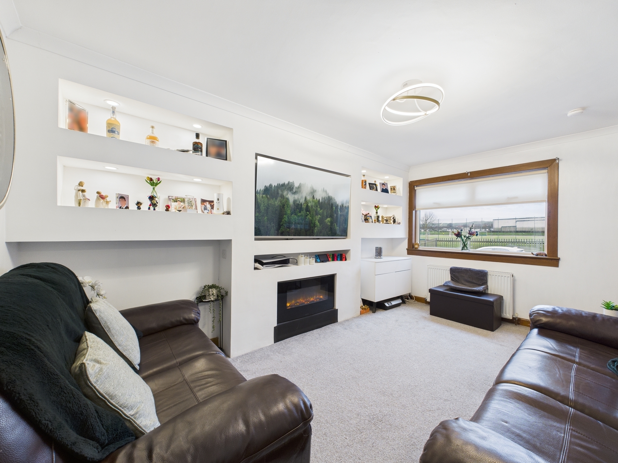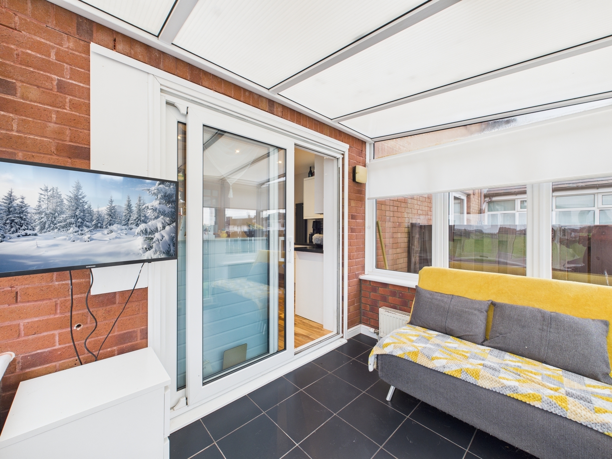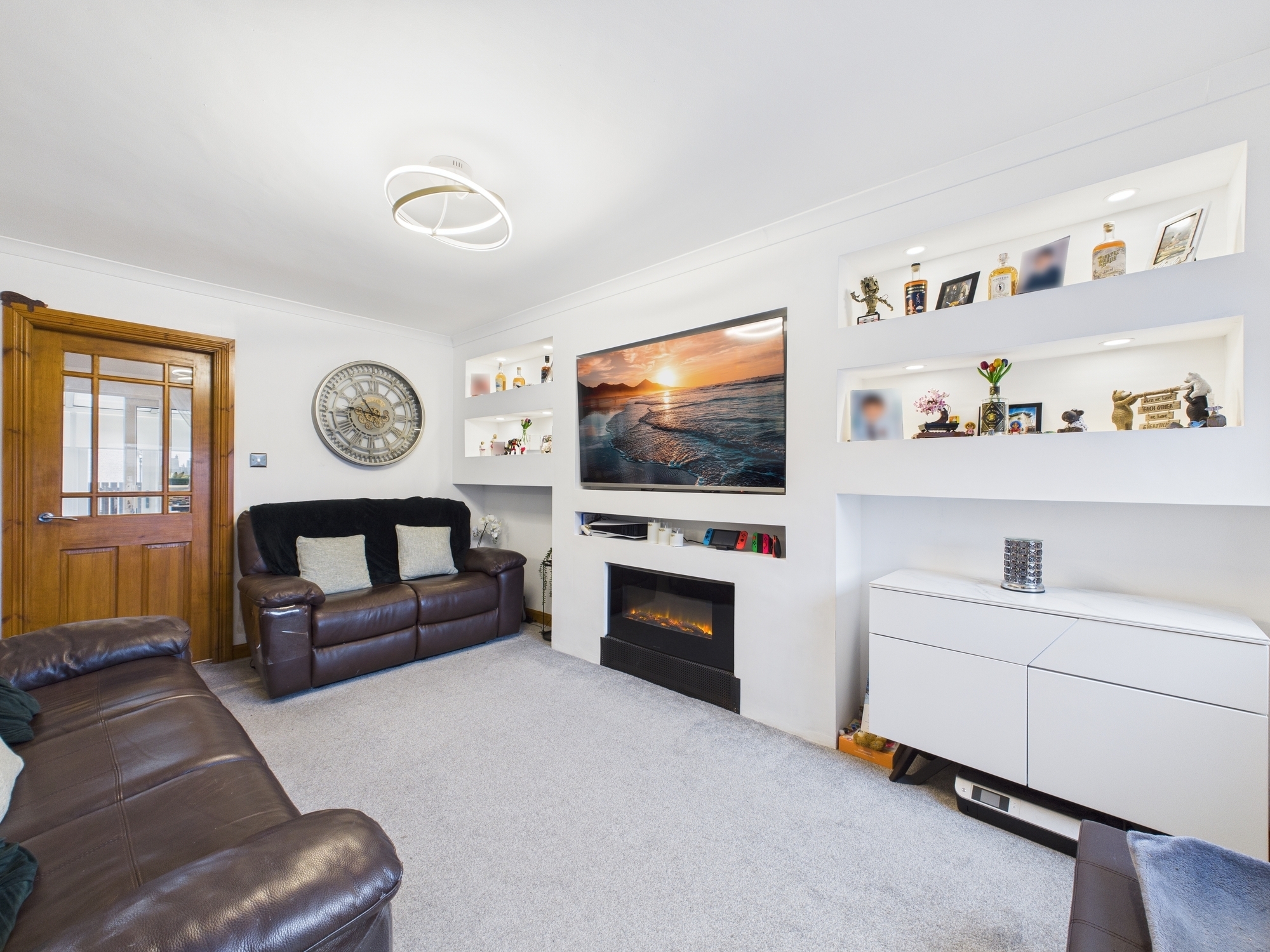 Upon entering, the welcoming entrance hallway leads seamlessly into the spacious, front-facing lounge complete with a modern media wall and ample space to accommodate a variety of furniture needs. From here, you will find the contemporary fitted kitchen featuring plentiful storage, space for white goods and a large storage cupboard. The kitchen opens directly into a rear facing sunroom, an ideal space for relaxing or perfectly suited for use as a home office.