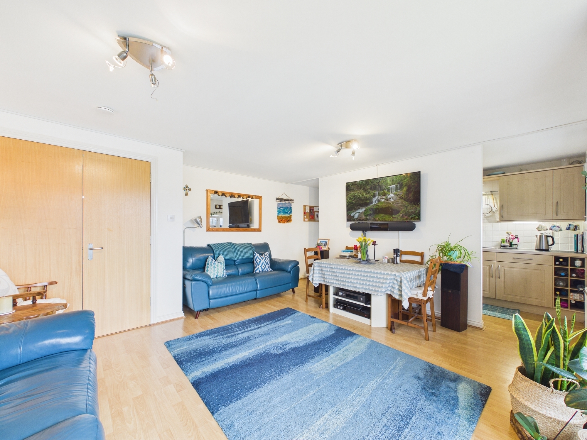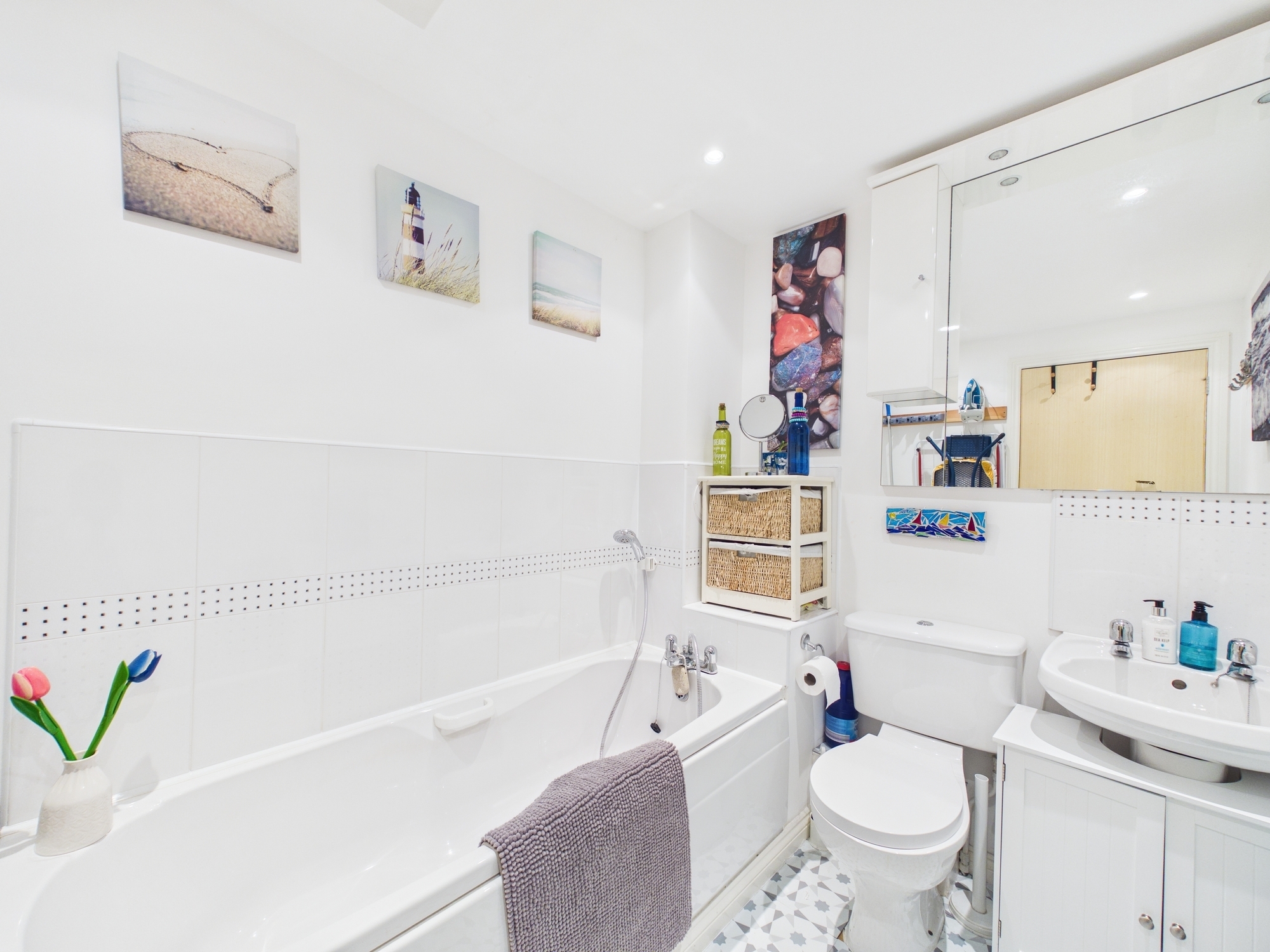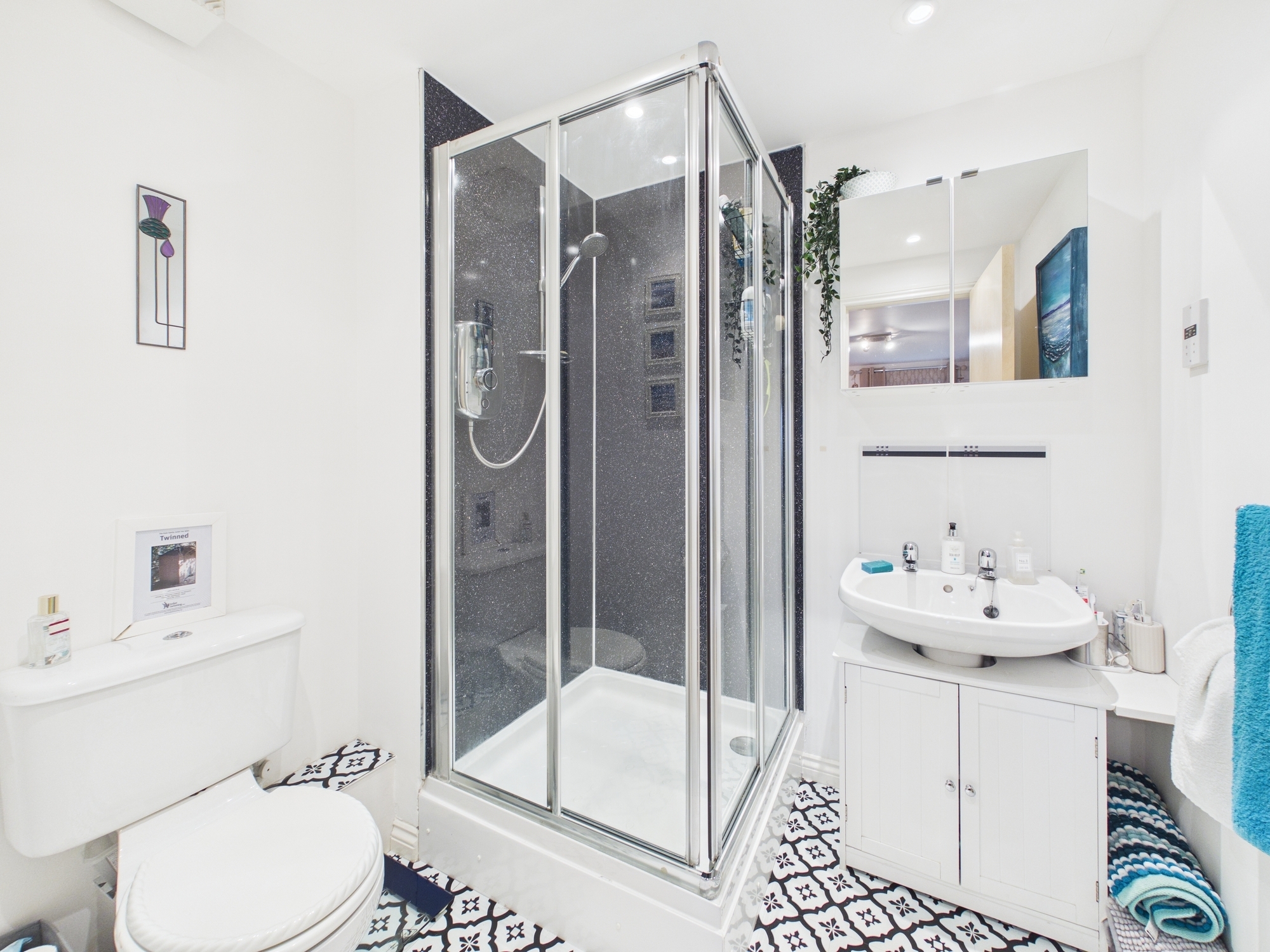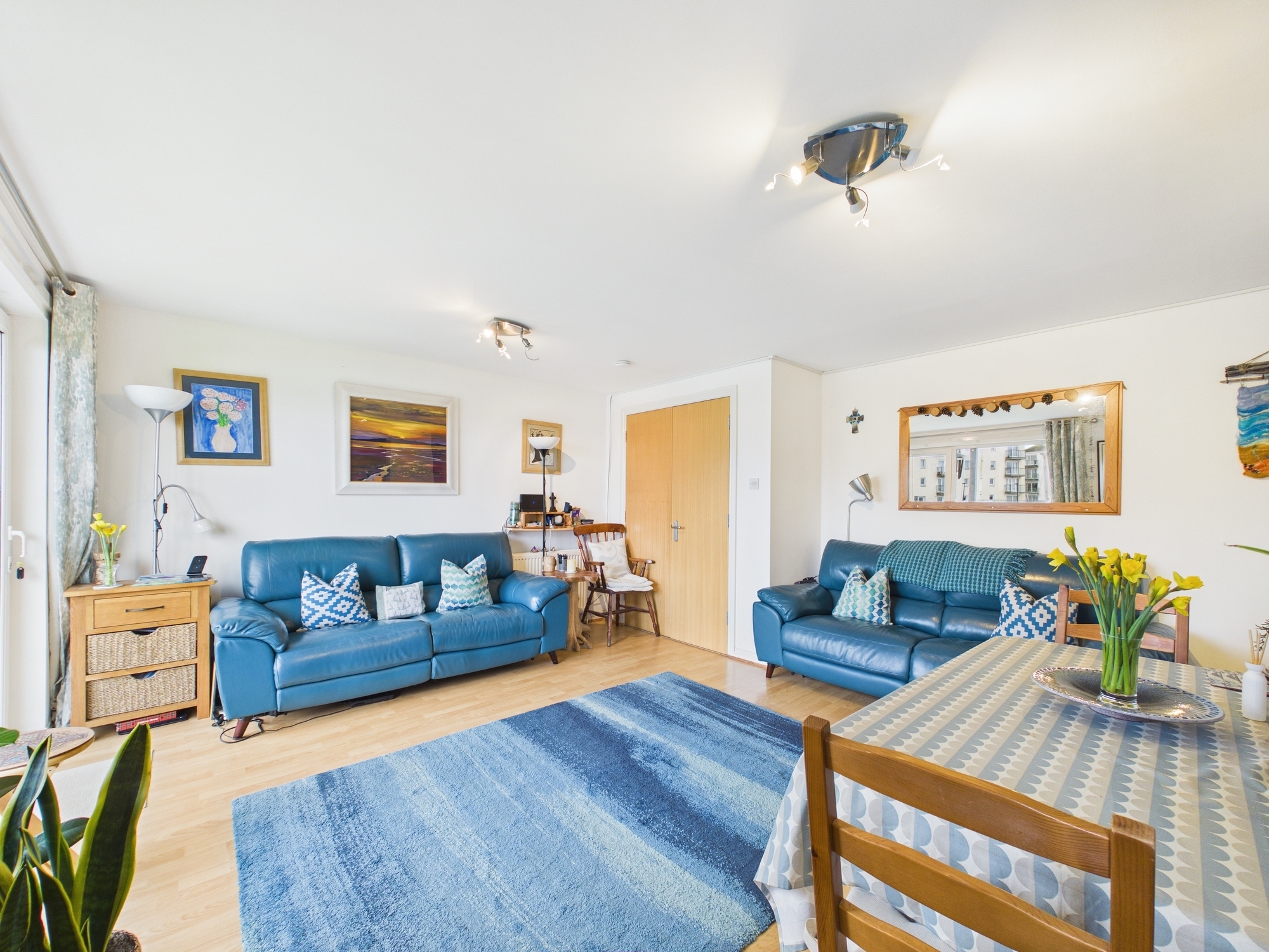 The generous principal bedroom benefits from mirrored sliding wardrobes, plenty of space for freestanding furniture and a modern en-suite shower room. Bedroom two also features mirrored sliding wardrobes and an additional storage cupboard with opening door. Both bedrooms have privacy film fitted on to the windows.