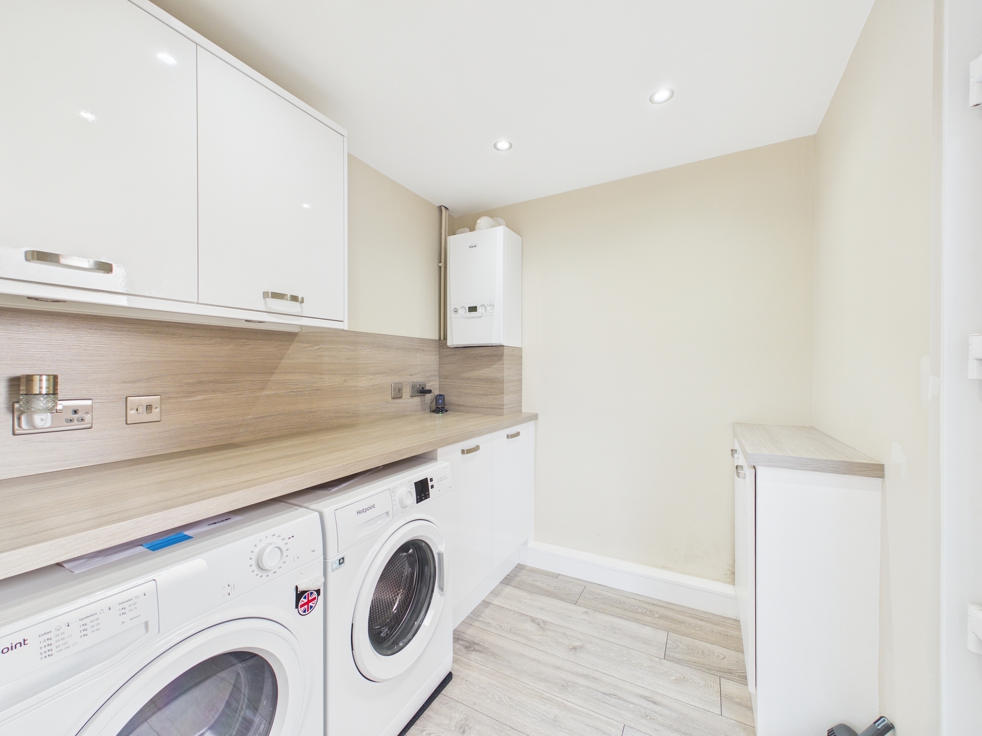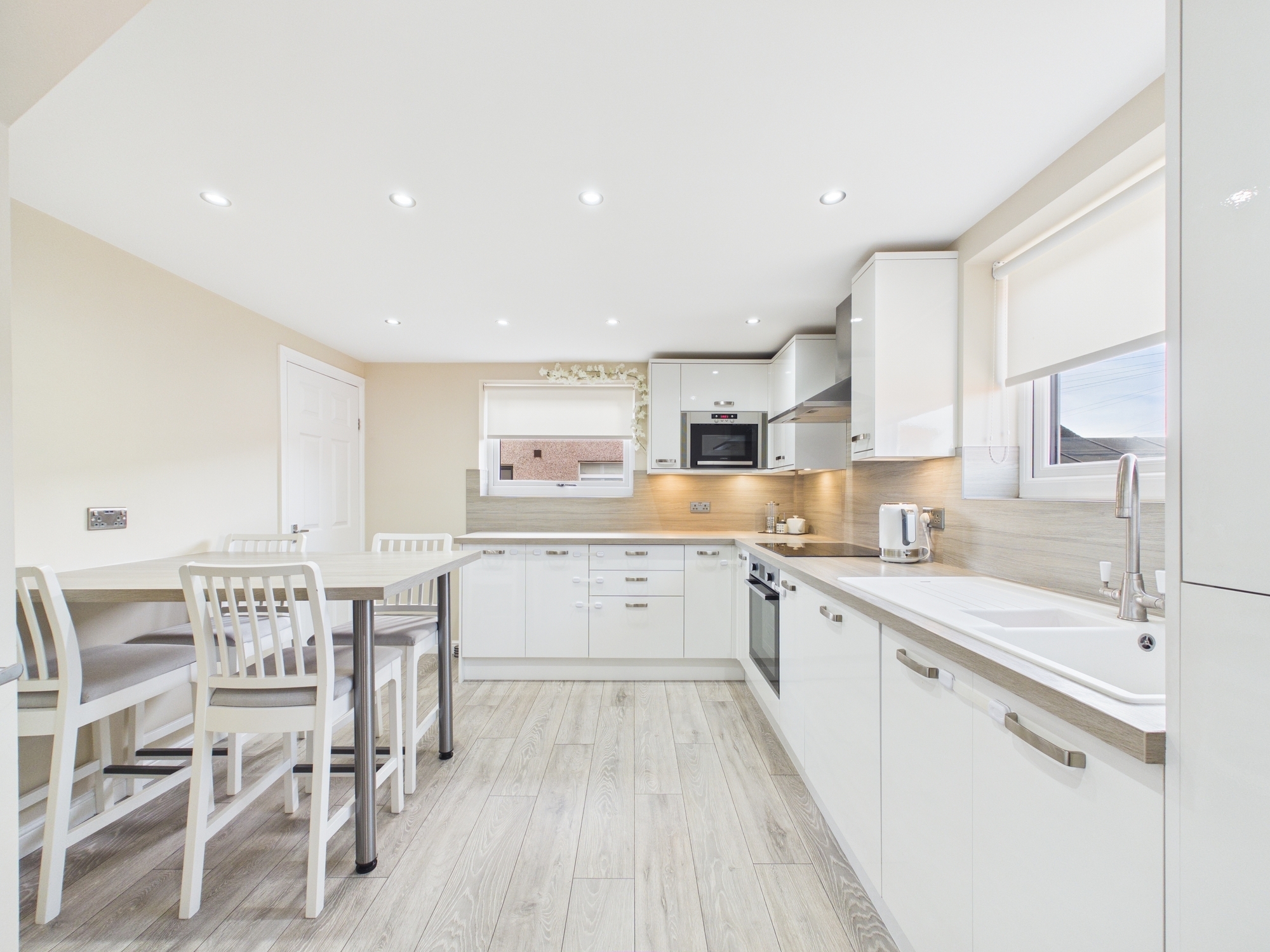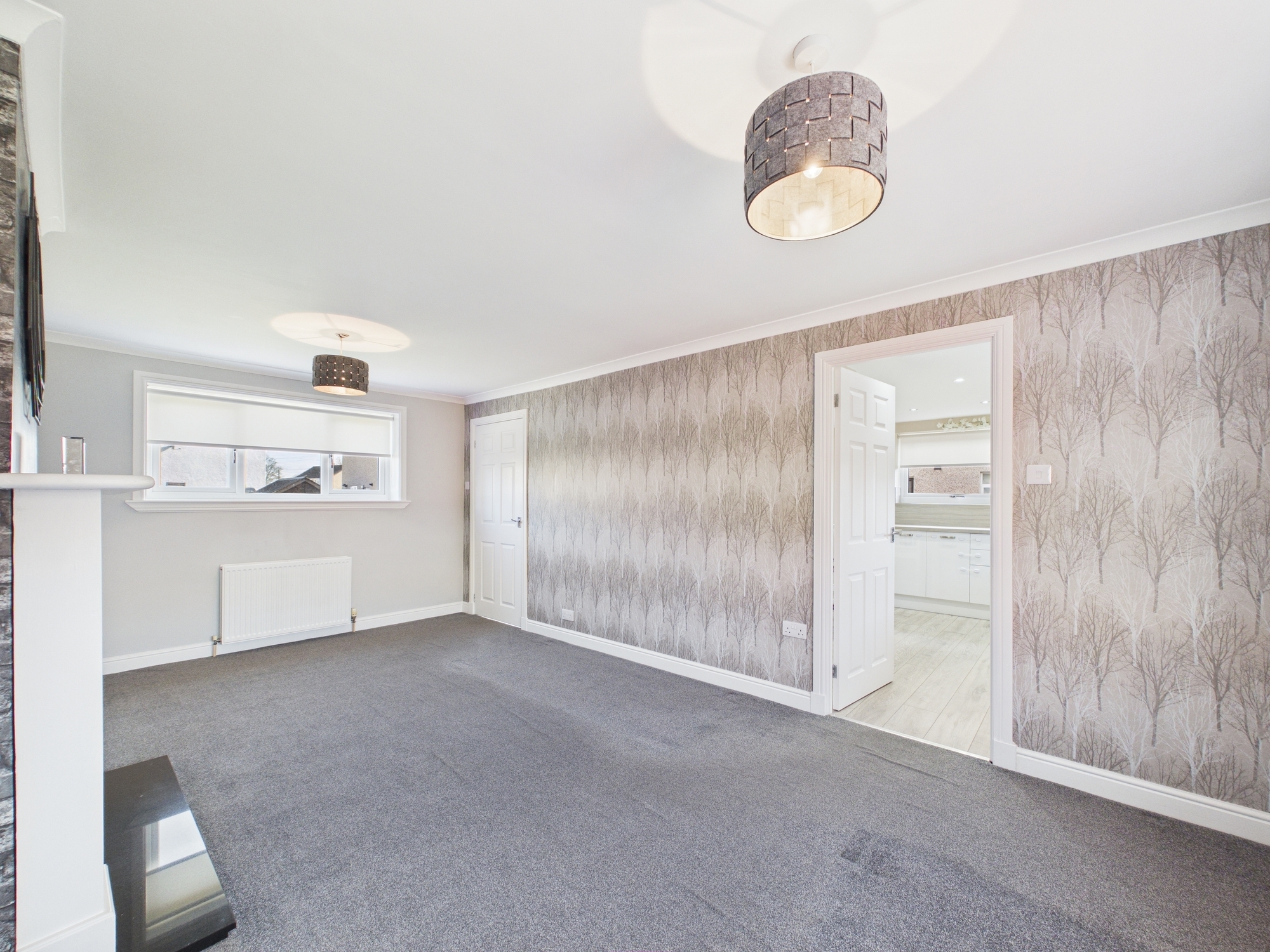 The accommodation begins with a bright and welcoming entrance hallway, leading into a spacious front and rear facing formal lounge. Large picture windows flood the room with natural light, creating a warm and inviting living space. Just off the lounge lies a modern, well-appointed fitted kitchen offering ample storage and generous space for dining. The ground floor is completed with a practical utility room, providing additional worktop space, storage and housing for white goods.